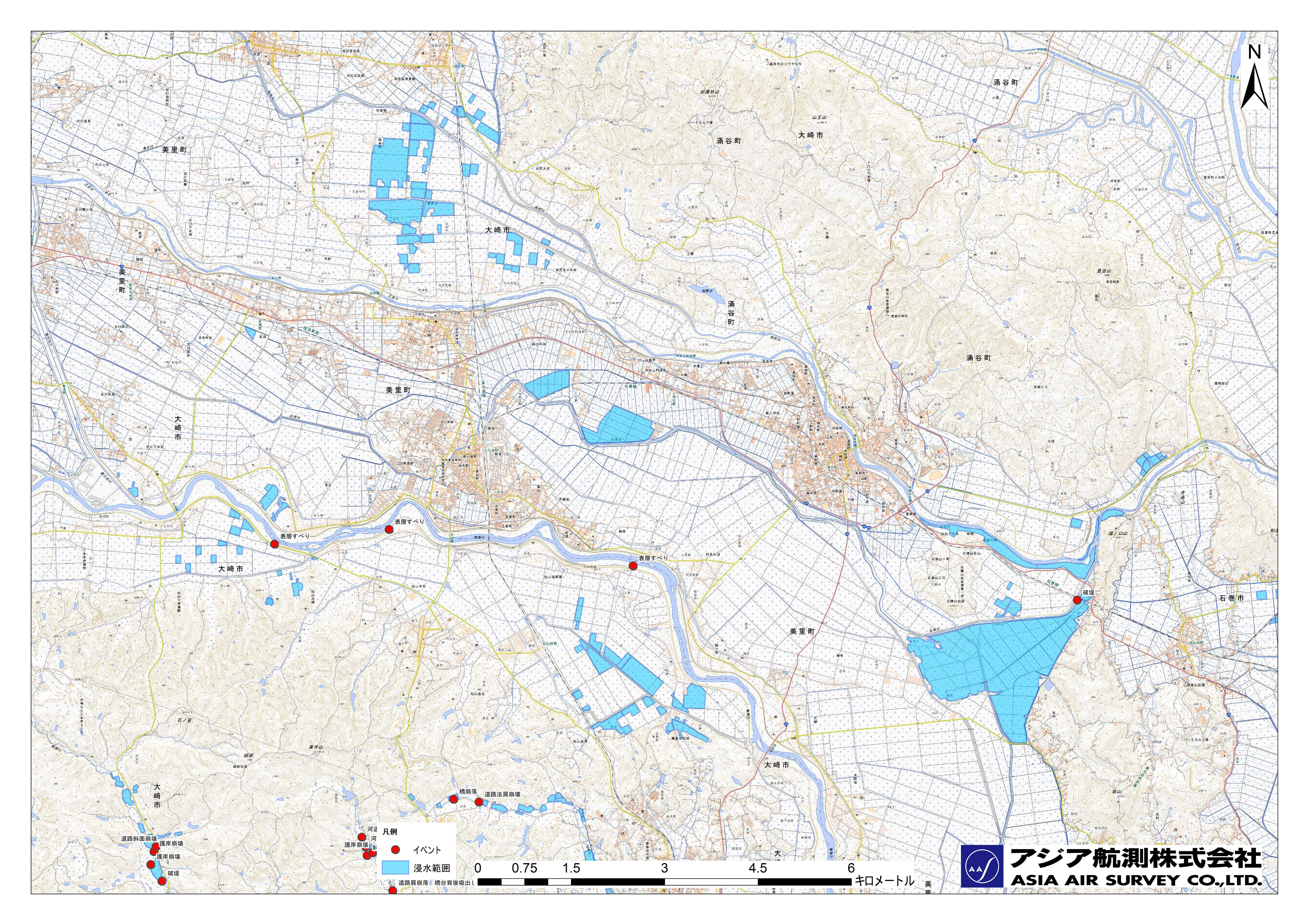 このたびの大雨災害において被害に合われた方々に心よりお見舞いを申し上げます。 活発な前線の影響により、宮城県では2022年7月15日から記録的な大雨になり、冠水や土砂崩れなどの被害が発生しました。 当社では朝日航洋株式会社と共同で7月18日に航空機から一部地域の斜め空中写真撮影を実施しました。 ここでは撮影した画像のうち、一部を掲載しています。 弊社技術が、現地の詳細解明ならびに二次災害の抑制に少しでもお役に立てば幸いです。