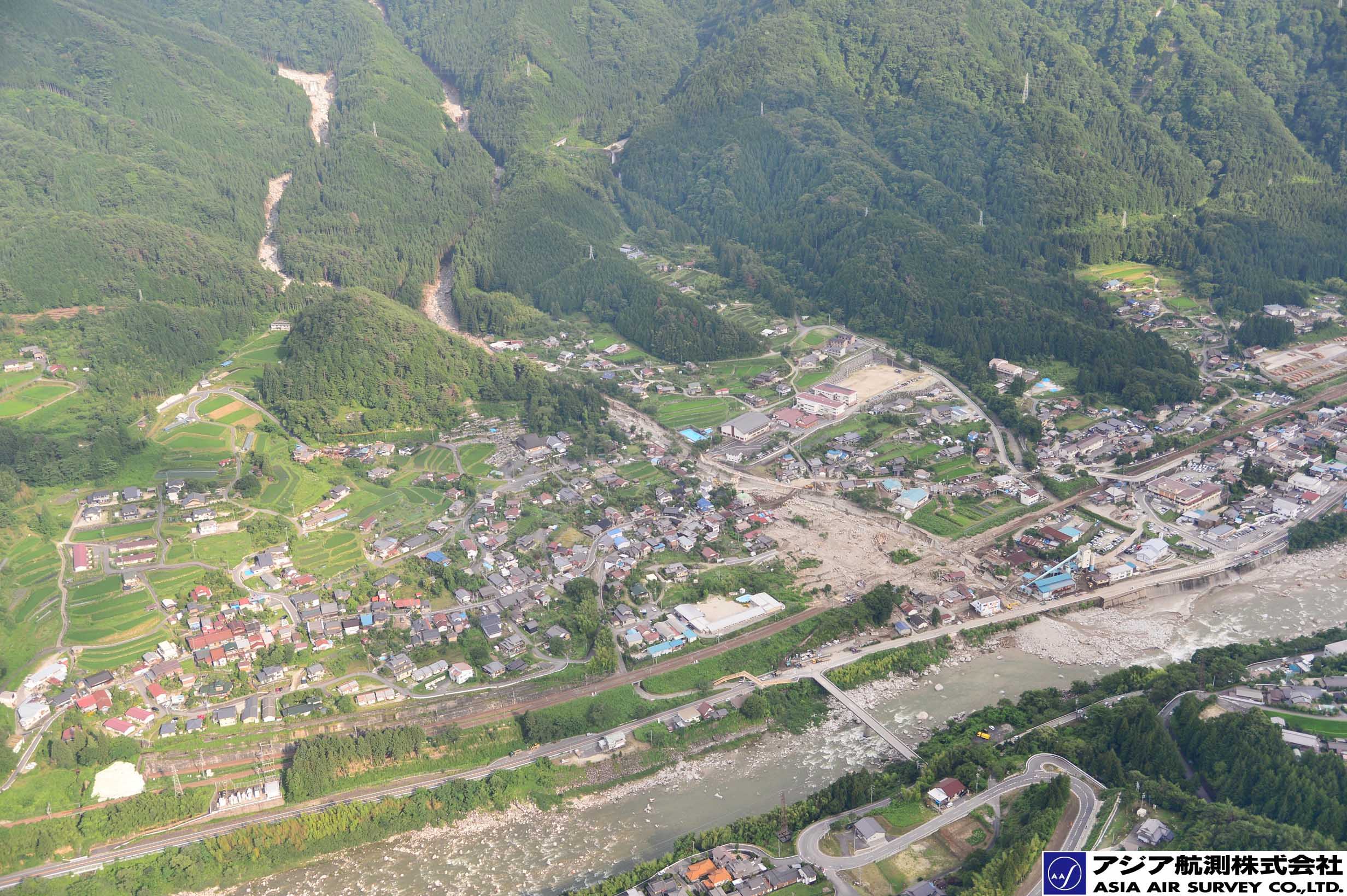平成26年台風第8号は、7月9日午後日本に接近し、大雨や暴風により多数の被害が発生しました。長野県木曽郡南木曽町では、梨子沢上流の大梨子沢と小梨子沢の2つの沢でほぼ同時に土石流が発生し、民家を飲み込み、中学生1人が死亡しました。 アジア航測では、この災害に対して被災地の緊急撮影を実施いたしました。得られた情報は随時ホームページ上で公開して参ります。 弊社技術が、現地の詳細解明ならびに二次災害の抑制に少しでもお役に立てれば幸いです。