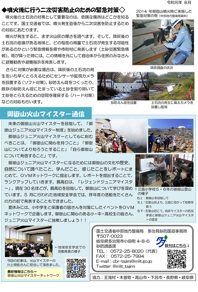 国土交通省中部地方整備局多治見砂防国道事務所は、「御嶽山火山防災だより」Vol.21(令和元年8月号)を公開しました。