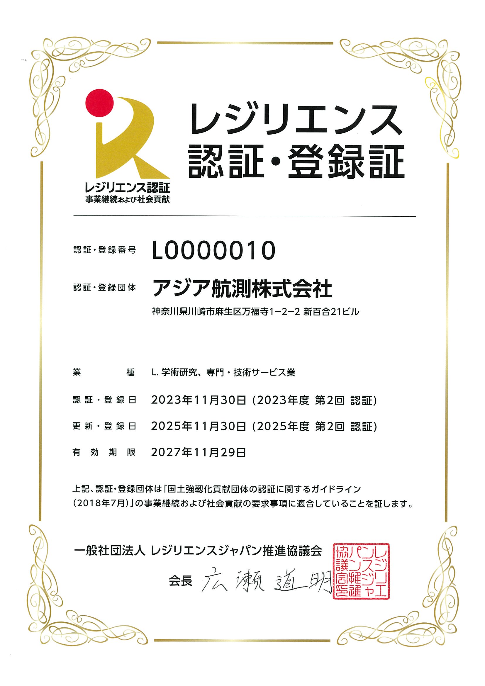 アジア航測株式会社はこのたび、内閣官房国土強靭化推進室「国土強靭化貢献団体の認証に関するガイドライン」に基づく2025年度第2回の国土強靭化貢献団体認証(レジリエンス認証)審査を受け、認証を更新しましたのでお知らせ致します。