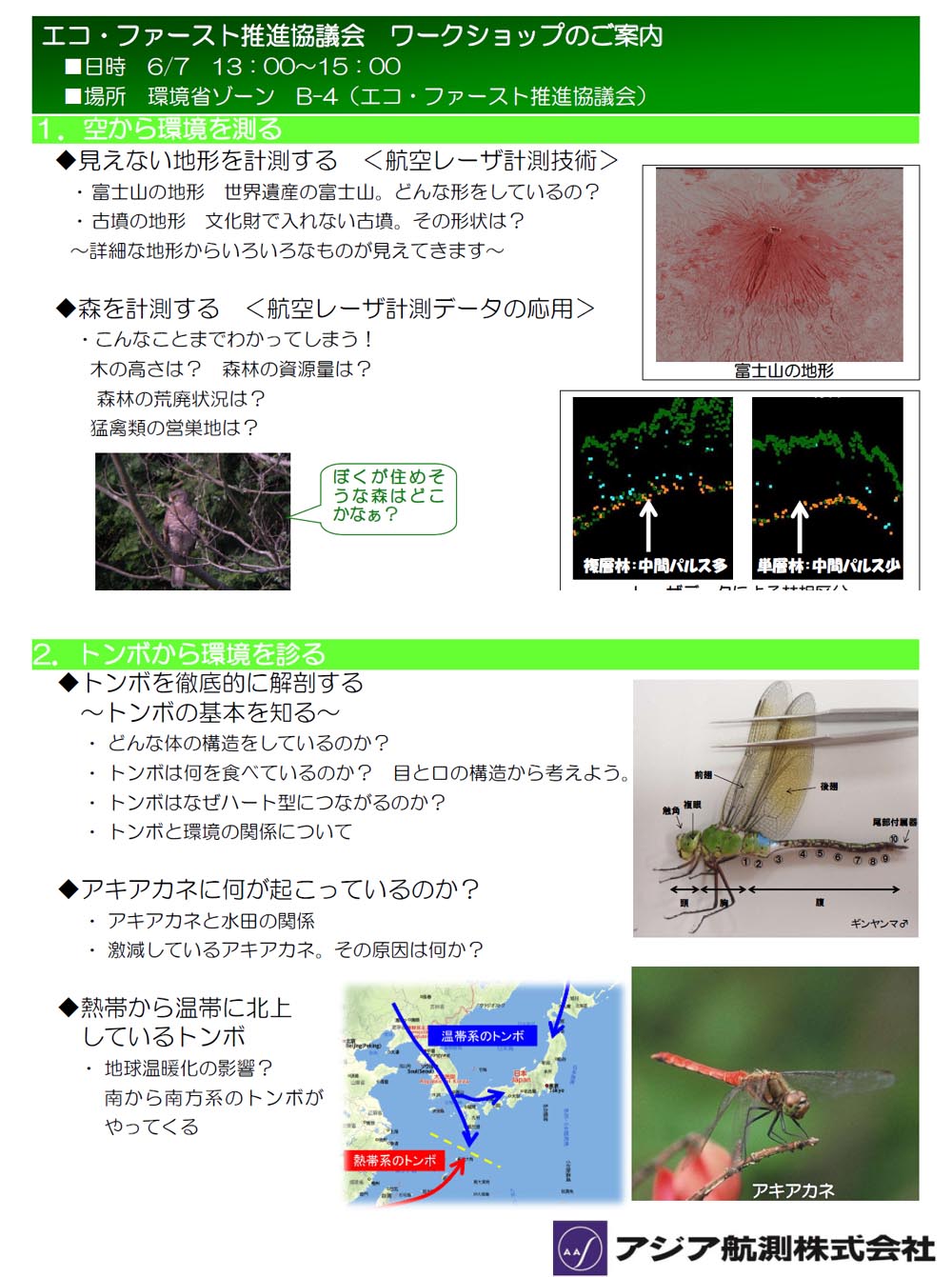 アジア航測は、環境省認定『エコ・ファースト企業』(環境先進企業)の一員として、環境省ゾーンで「メッセージクイズ!」とワークショップを行います。