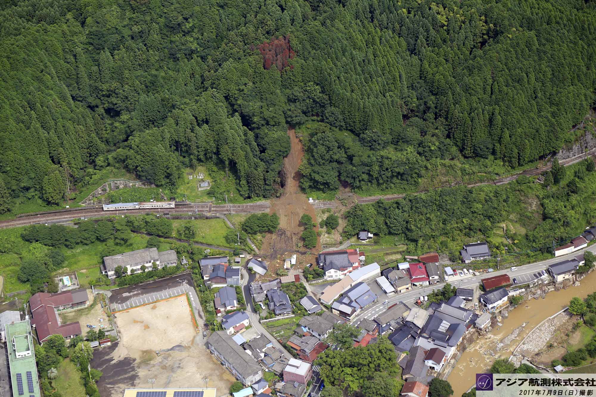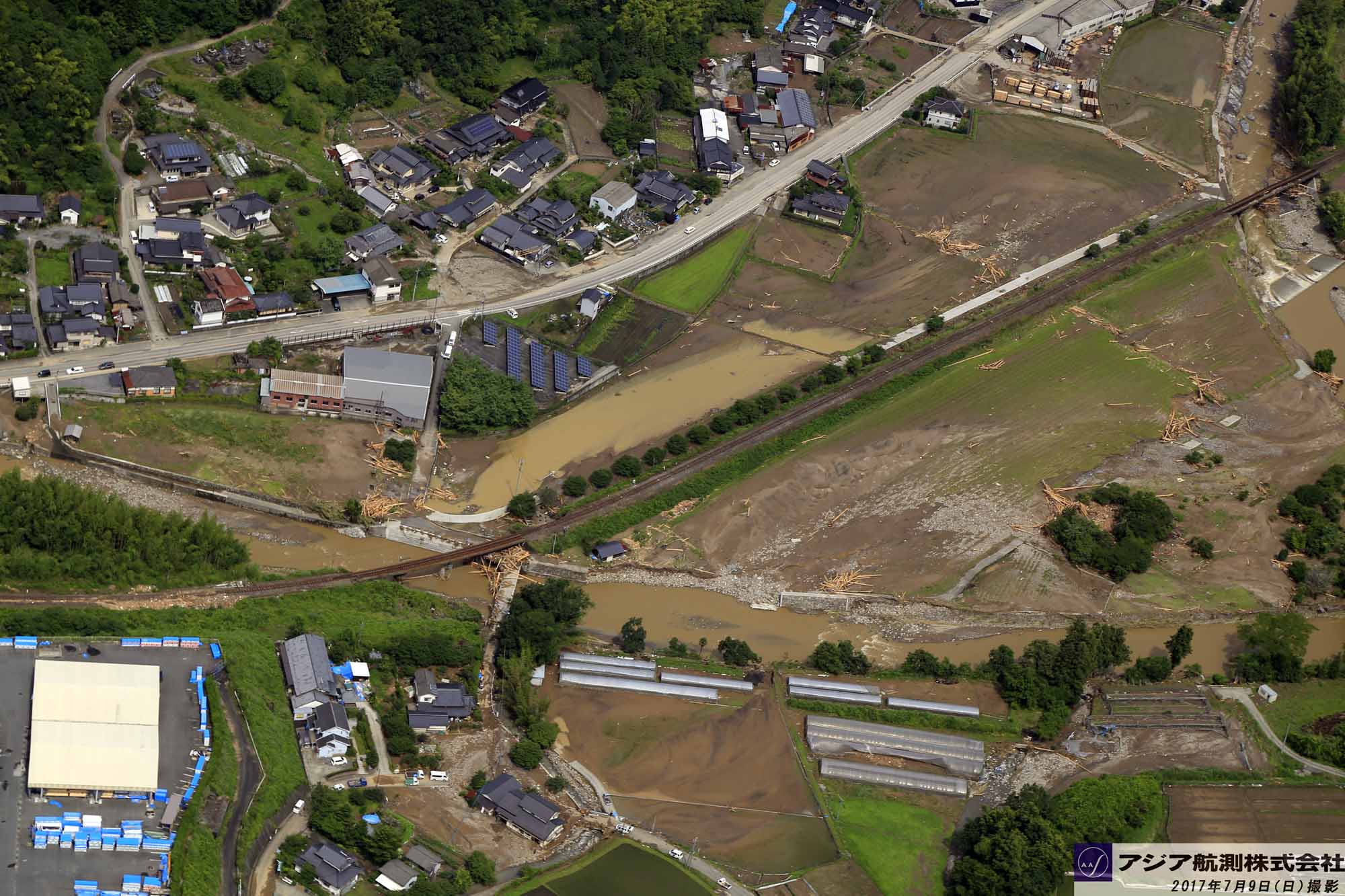 東峰村大行司付近。JR日田彦山線の線路も土砂に埋まっているのが確認できます。 |