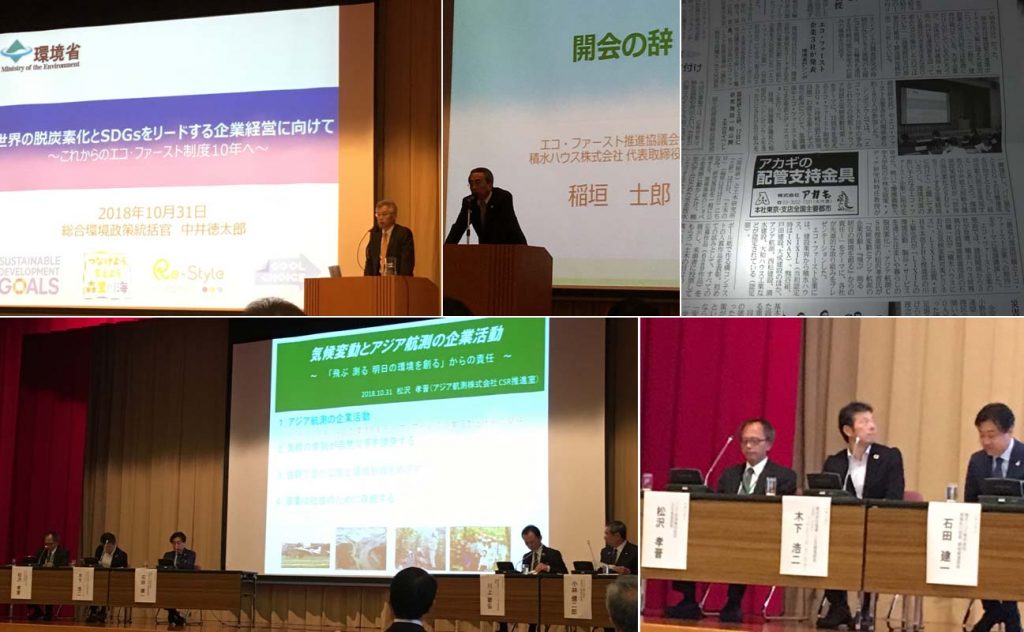 開会の辞 環境省 総合環境政策統括官 中井 徳太郎様 挨拶 エコ・ファースト推進協議会 議長 稲垣 士郎様 (積水ハウス㈱ 代表取締役副会長) 基調講演 「最近の環境問題とエコ・ファースト企業への期待」 小林 光様 (元環境事務次官、慶應義塾大学大学院政策メディア・研究科教授) 発表Ⅰ 「エコ・ファースト10年の歩み」 百瀬 則子様(ユニー㈱ 顧問) 発表Ⅱ 「タラノア対話へのエコ・ファースト推進協議会の取組み」 坂本 慶太様 (㈱電通 法務マネジメント局 CSR推進部 部長) パネルディスカッション「SDGsにおける企業の先進的な取組事例とこれからの役割」 コメンテーター: 後藤 敏彦様(サステナビリティ日本フォーラム 代表理事) パネリスト: ライオン㈱ 小林 健二郎様(取締役上席執行役員) ㈱LIXIL 川上 敏弘様(EHS推進部長) 積水ハウス㈱ 石田 建一様(常務執行役員 環境推進部長) ㈱電通 木下 浩二様(法務マネジメント局 CSR推進部長) アジア航測㈱ 松沢 孝晋(CSR推進室長) 以上5社 |