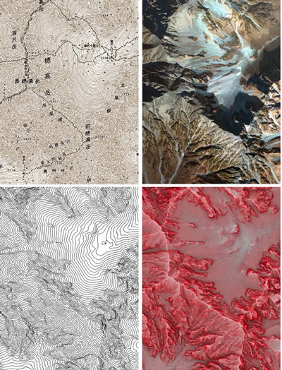 「赤色立体地図」は、アジア航測独自開発によるこれまでにない全く新しい地形表現技法です(特許第3670274号) 。線も記号も光影も使わず、実際にそこにある地形を、1枚の地図で立体的に見える表現技法です。回転しても、拡大・縮小しても立体感は失われず、等高線や衛星写真などとの重ね合わせも得意。驚くほどに地形がわかる21世紀のマップスタンダードです。