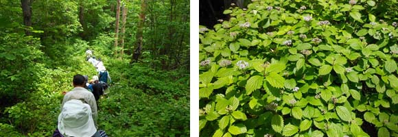![]() 小紫陽花に囲まれながら林道を進む 大きく株立ちした小紫陽花が群落を作る ![]() 小紫陽花の花 (白が主だが、青や紫がかったものもある) 目の前に広がる花にばかり見とれていると、地面の様子を見落としてしまいがちだが、何と見事なギンリョウソウ(銀竜草 イチヤクソウ科ギンリョウソウ属 別名ユウレイタケ)がひっそりと地面に生えているではないか。真っ白い姿には一瞬「・・・何だこりゃ!」と身を引きそうであるが、葉緑素を持たない植物で、いわゆる寄生植物である。良く見ると、真っ白に透き通った花や薄紫色したもの等、変化ある世界だ。 ![]() ギンリョウソウ ギンリョウソウのすぐ近くには、緑に苔むす切株がじっと我らを見つめている様である。もう10年近くも経つであろうか、間伐で切り残された台木である。この小紫陽花ロードを行交う沢山の人々を見つめて来たはずである。黙して語らぬこの切株は、一体何を考えているのであろうか。 ![]() “ ・・・ ” |